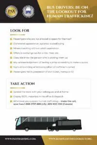 One of the first and most important steps in the fight against human trafficking is knowing what to look for. This poster will help teach chauffeurs what to look for and what to do when they see the signs of human trafficking.