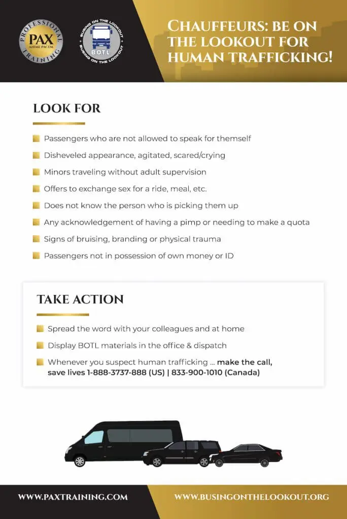 One of the first and most important steps in the fight against human trafficking is knowing what to look for. This poster will help teach chauffeurs what to look for and what to do when they see the signs of human trafficking.
